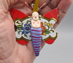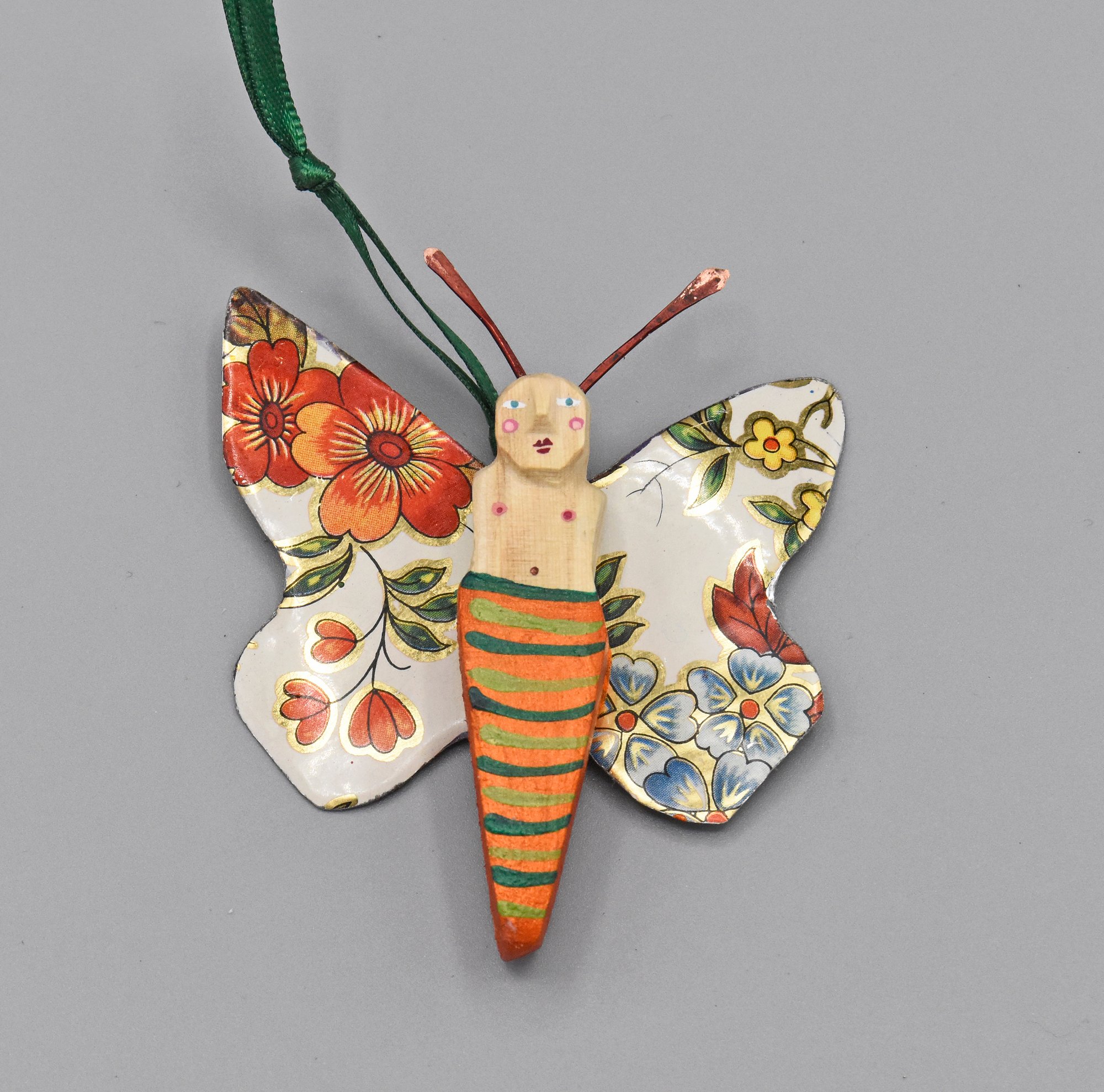 The Butterfly Babies are carved from fallen aspen wood collected in the mountains of Northern Arizona and New Mexico. The wings are made of vintage tins. They have hammered wire antennae. They're delicately painted with acrylic and finished with wax. Each has a small hook on the back to easily hang it. Size: 2.75" x 2.5"