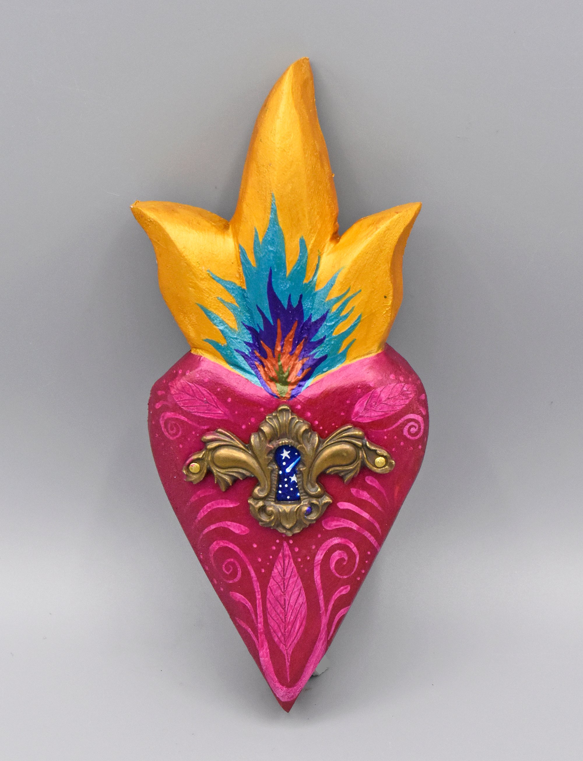 The Blossoming Heart Series is inspired by sacred hearts found in Latin American folk art. These hearts are made with materials that are nailed, chipped, and worn. Sometimes our hearts have to go through a bit of wear in order to grow strong and blossom. Carved from found wood this radiant heart is crowned with flames. There's a vintage escutcheon with tiny painted clouds inside nailed to the delicately detailed surface. The wood is painted with acrylic. There's a hook on the back to hang it.