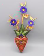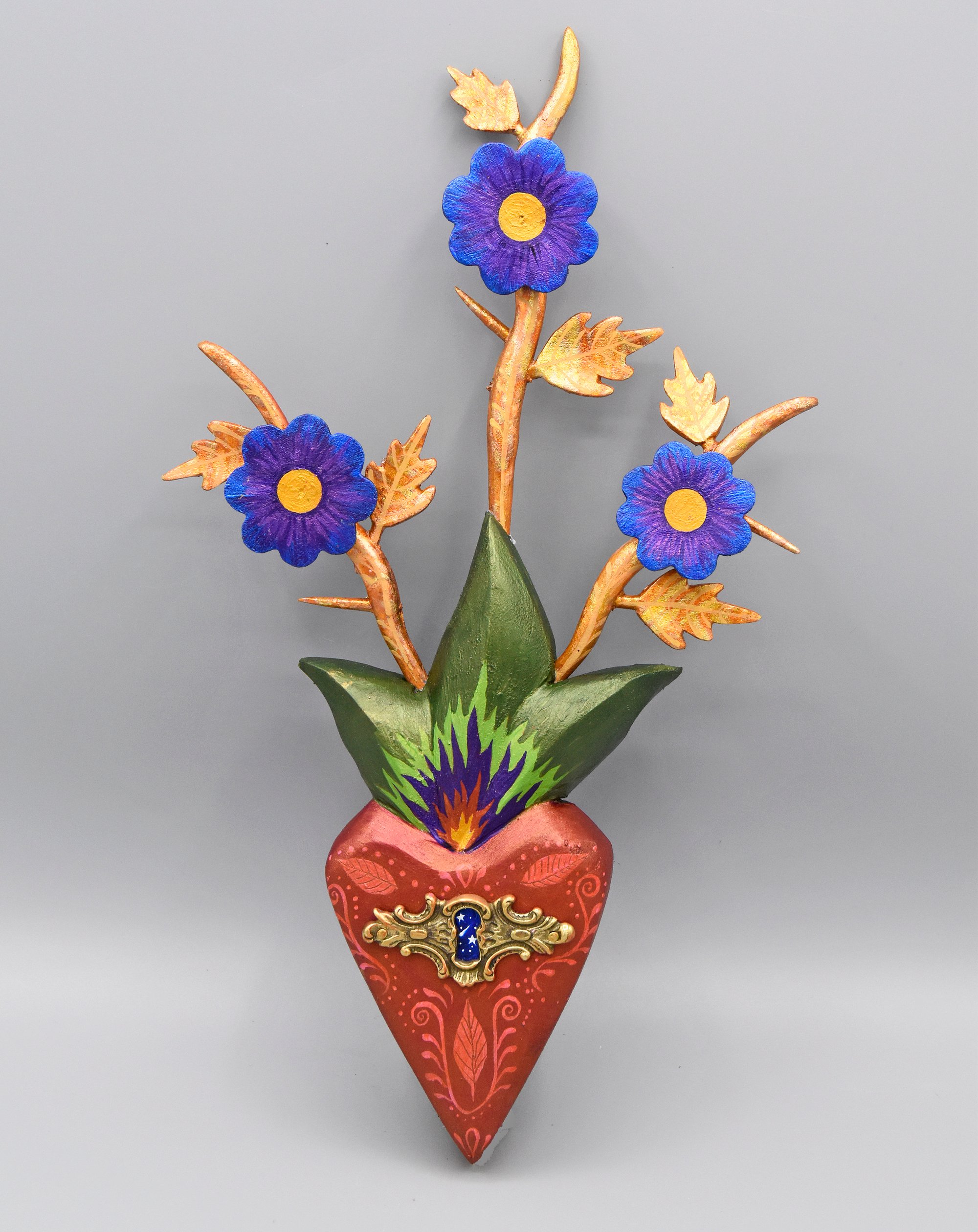 "Wherever your heart is, that is where you'll find your treasure." ~from The Alchemist by Paulo Coelho Carved from found aspen wood this radiant heart is crowned with flames, leaves, and flowers. There’s a an antique keyhole escutcheon nailed to the delicately painted surface. Inside the keyhole are tiny painted stars in a night sky. The wood is painted with acrylic. There is a hook on the back to hang the artwork. Size: 12" x 7" x 1.5"